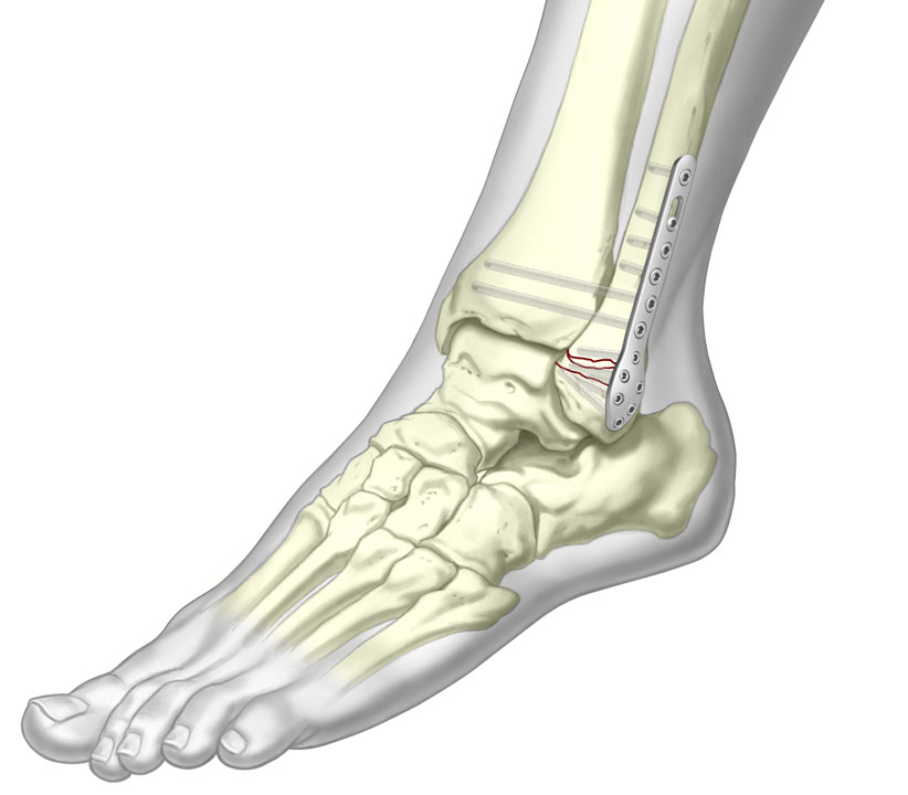 Placa contorneada de perfil bajo con orificio de tornillo desplazado para fijación biplanar